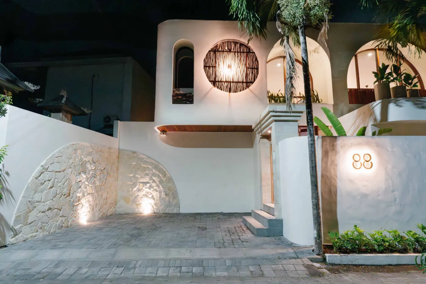 Cozy Balinese bedroom with king bed adorned in white linens and towel swans, arched niche headboard, pendant lights, round mirror, and woven basket shelves.